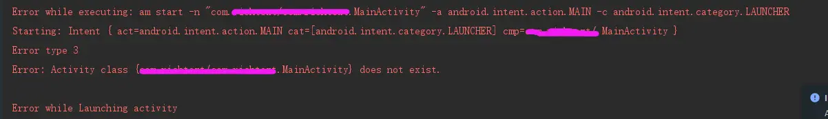Error while executing: am start -n "com.xx.xx/com.xx.xx.MainActivity" -a android.intent.action.MAIN -c android.intent.category.LAUNCHER Starting: Intent { act=android.intent.action.MAIN cat=[android.intent.category.LAUNCHER] cmp=com.xx.xx/.MainActivity } Error type 3 Error: Activity class {com.xx.xx/com.xx.xx.MainActivity} does not exist.