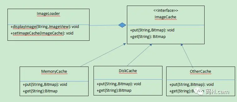 那么接下来我们应该怎么修改ImageLoader类呢,很简单,首先你要明白,既然所有的缓存方式都扩展自ImageCache ,那么所有的扩展类又可以称之为一个ImageCache。明白这一点,那下面的代码就不难理解了。