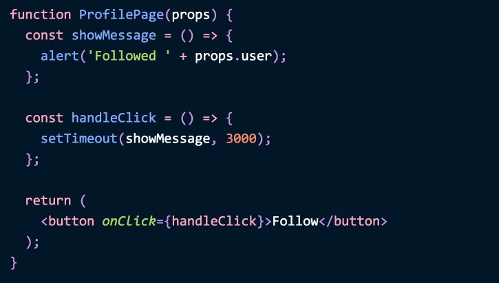 当父组件传入不同的props来重新渲染 ProfilePage时,react会再次调用 ProfilePage。但是在这之前,我们点击关注按钮的事件处理函数,已经捕获了上一次render时的props。