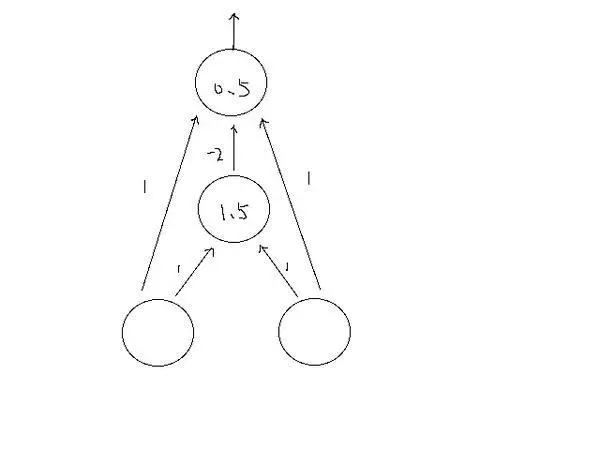 其中直线上的数字为权重。圆圈中的数字为阀值。第二层,如果输入大于1.5则输出1,否则0;第三层,如果输入大于0.5,则输出1,否则0. 我们来一步步算。 第一层到第二层(阀值1.5)