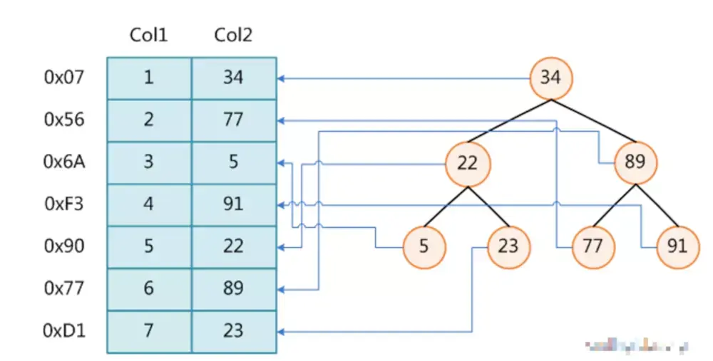 图1展示了一种可能的索引方式。左边是数据表,一共有两列七条记录,最左边的是数据记录的物理地址(注意逻辑上相邻的记录在磁盘上也并不是一定物理相邻的)。为了加快Col2的查找,可以维护一个右边所示的二叉查找树,每个节点分别包含索引键值和一个指向对应数据记录物理地址的指针,这样就可以运用二叉查找在O(log2n)的复杂度内获取到相应数据。