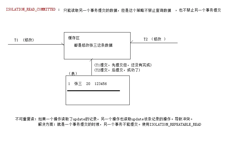 ISOLATION_READ_COMMITTED :只能读已提交的数据,(解决脏读问题,ORACLE默认)