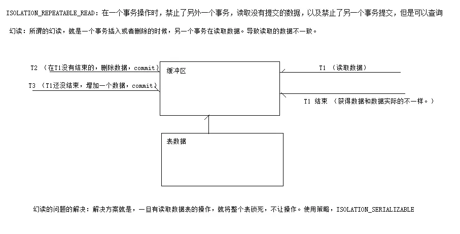 ISOLATION_SERIALIZABLE:是否读取其他提交增加后的数据,解决幻读问题(在一个事务操作时,例外一个事务不能提交,也不能查询)