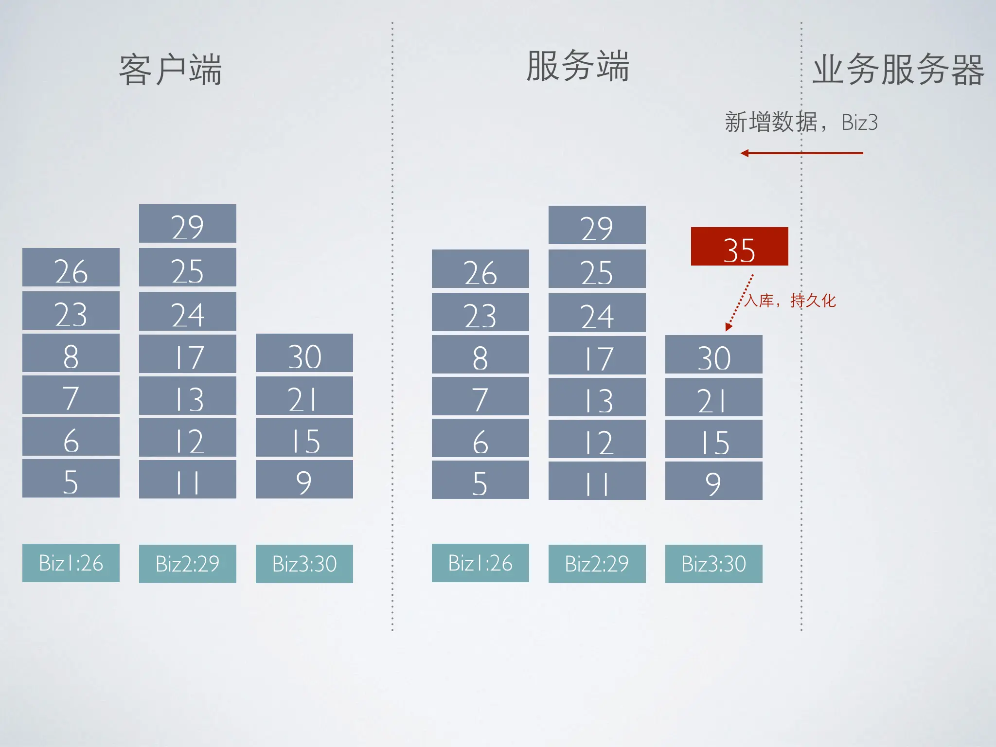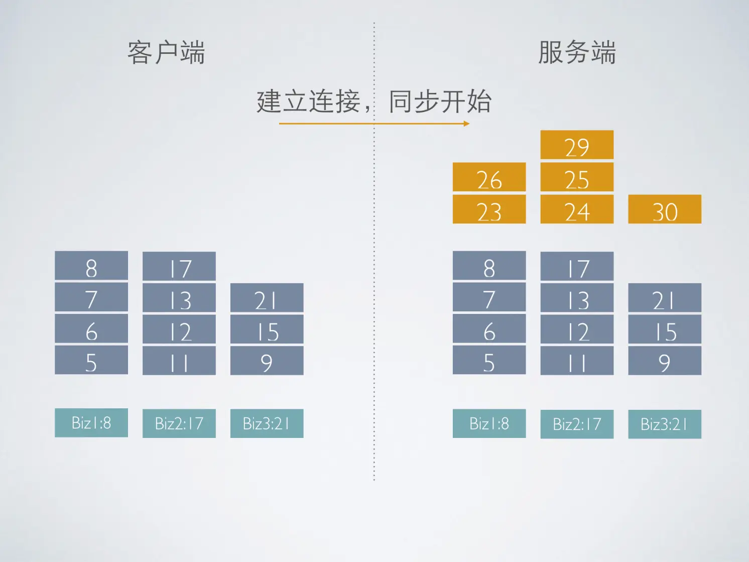 假定,客户端有三个业务:Biz1,Biz2,Biz3。它们各自的同步点为:8,17,21。