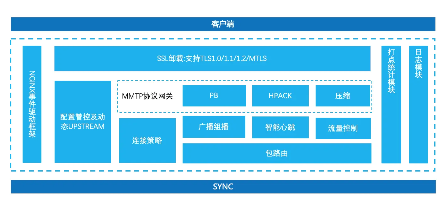 Accgw 承接进行了 TLS 卸载、配置管控、动态 UPSTREAM 路由、MMTP 协议解析、数据包压缩、连接保持、流量管控、以及负载均衡等职责,而 MSS(SYNC)即为 UPSTREAM 路由的其中一个渠道,因此,Accgw 所拥有的超级能力完全被 MSS(SYNC)所应用。