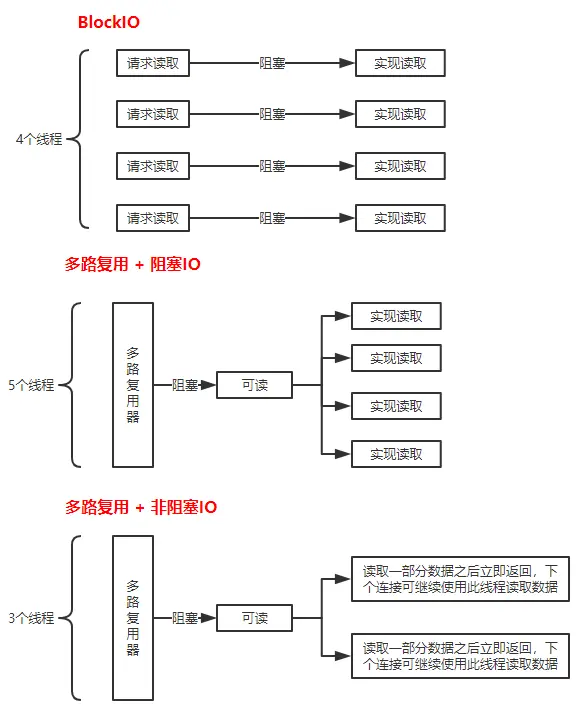 一般来说,在从多路复用器得到了一个连接可读或者可写的讯息之后,我们就需要对这个连接进行读写操作了。因为多路复用器所在的线程可能会阻塞,所以我们一般会把这些连接的读写操作放到新的线程中。因为读写操作本身也可能导致线程阻塞(例如读取数据的数量还不满足要求),所以此时我们仍然需要为每一个连接的读写操作开辟新的线程(也可以使用线程池),这在读写连接较少的情况下没什么问题,但是在有大量连接都需要进行读写操作时仍然会产生大量的线程,降低系统吞吐量。