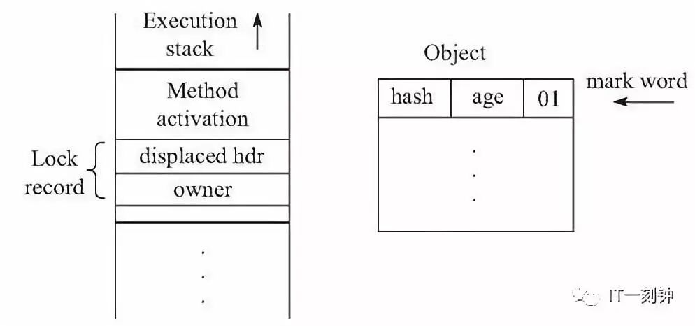 2.将锁对象头中的Mark Word拷贝到当前线程的Lock Record中,称为Displaced Mark Word,然后使用CAS,将对象头中的Mark Word修改为指向当前线程栈中Lock Record的指针(如图)。如果成功,则获取轻量级锁,执行同步块中的代码,如果失败,则进行自旋竞争锁,自旋达到一定的次数如果依旧没有获取到锁,则升级为重量级锁(因为自旋会消耗CPU,为了避免无用的自旋,一旦锁升级为重量级锁,就不会恢复到轻量级锁,自旋的线程会被挂起阻塞住); CAS操作之前堆栈与对象的状态: