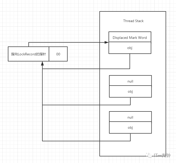假设锁的状态是轻量级锁,如图反应了Mark Word和线程栈中Lock Record的关系,右边线程栈中包含3个指向当前锁对象的Lock Record。其中栈中最高位的Lock Record为第一次获取锁时分配的,其中Displaced Mark word为锁对象加锁前的Mark Word,而之后的锁重入,则会在线程栈中分配一个Displaced Mark word为null的Lock Record,用来重入计数。