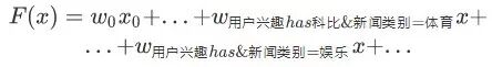 最开始做点击率预估的模型为LR(Logistic Regression),将上述特征代入LR模型可以得到一个简单的点击率预估模型。然而,在推荐情景中,用户的行为是稀疏的,即一个用户能看到的新闻是有限的,如何从用户有限的浏览中推测出用户可能喜欢的新闻,就是推荐工作的重点,在这里使用LR如果只是简单的对上述特征进行建模,是无法得到特别好的效果的,原因是LR模型本身无法对特征进行泛化,它只能对某特征直接计算其相应的权重𝔀,如果想使得LR具备泛化能力,则需要我们在数据端"手动泛化",例如: