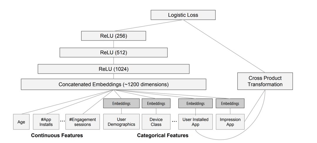 除了DNN,wide&deep模型额外添加了一个wide模型,实际上就是将上文中LR的特征组合过程作为一个独立模块加入模型中,例如上图所示,将用户安装过的App与当前曝光展现的App做一个组合特征作为wide model的其中一个特征,这里又可以结合业务知识去做特征组合,获得一些强泛化能力的特征。