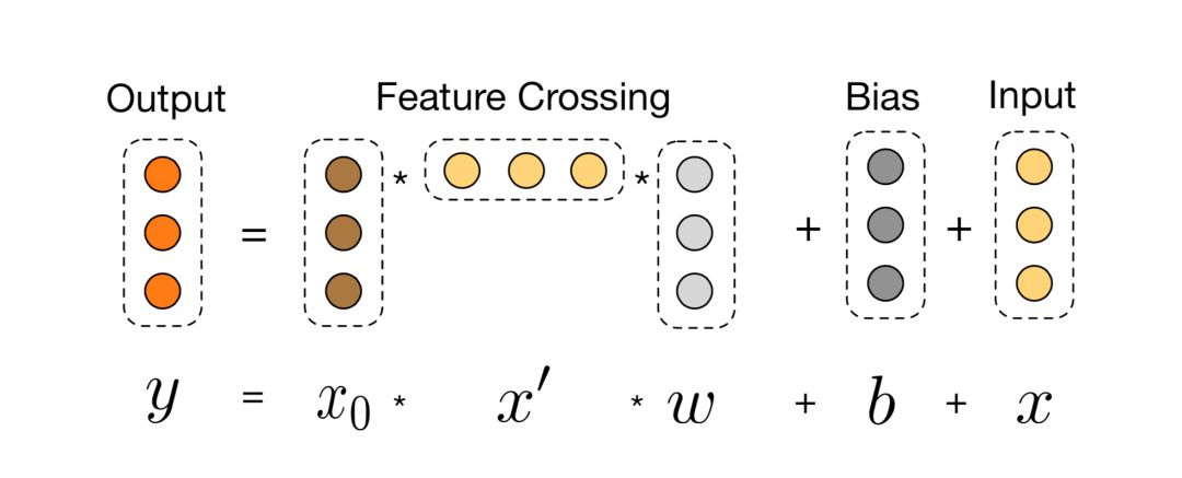 这种特殊的结构可以使得交叉特征的阶(degree)随着cross层增加,对于第 层,交叉特征相对于𝔁₀的阶为