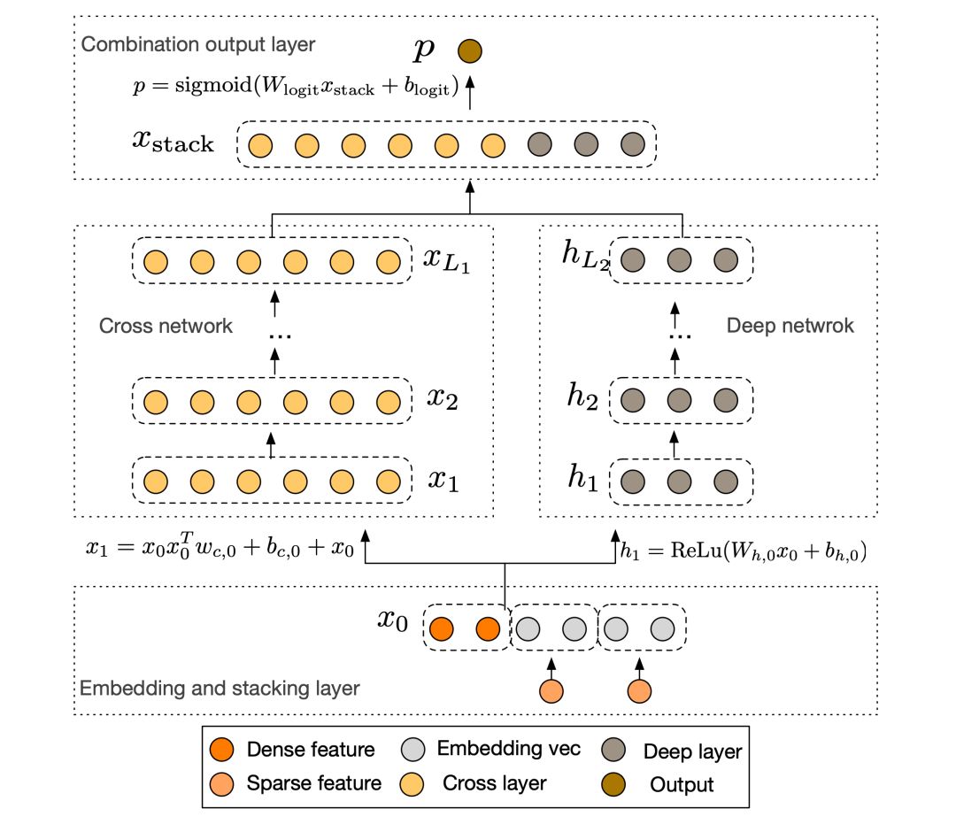DCN模型结构如上图所示,其基本结构和wide&deep网络类似,输入层对稀疏类别型特征采用Embedding的方式映射到一个低维密集向量,与数值型特征直接拼接起来作为网络输入特征。由于这是一个CTR预估模型,样本是0/1的二分类监督问题,所以输出层采用sigmoid将输出限定在[0,1]之间表示模型预估点击率。
