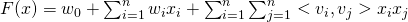 逻辑回归的F(x)的计算方式只包含线性关系,限制了模型的表达能力,可以通过增加非线性关系来增强模型的表达能力,具体地,FM模型公式如下: