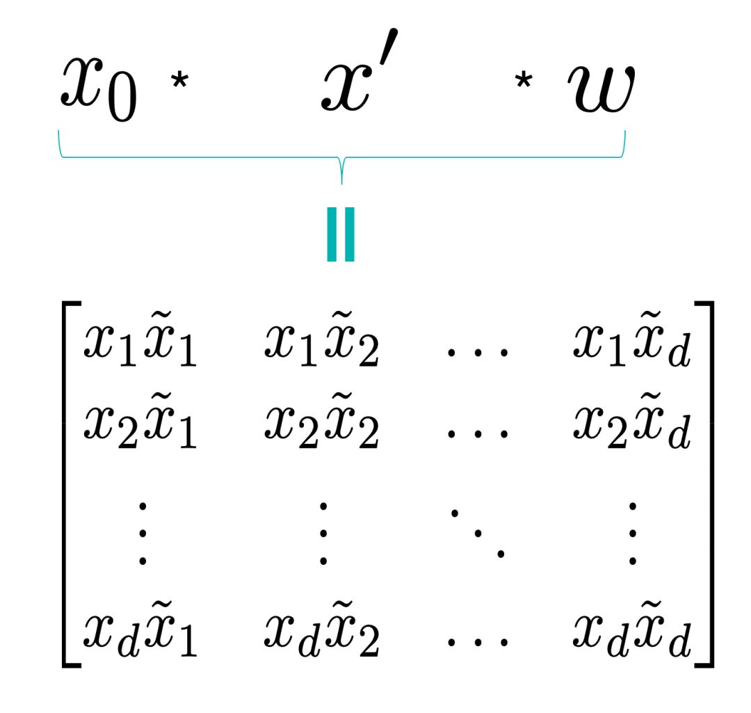 我们将原式的前两项相乘,这里面得到的每一个值都可以看作当前cross层特征与输入特征做了一次bit-wise的乘积,并且我们可以看作得到了一个𝓭²的行向量,再乘以一个块对角矩阵,其中列向量 ,将结果投影回了