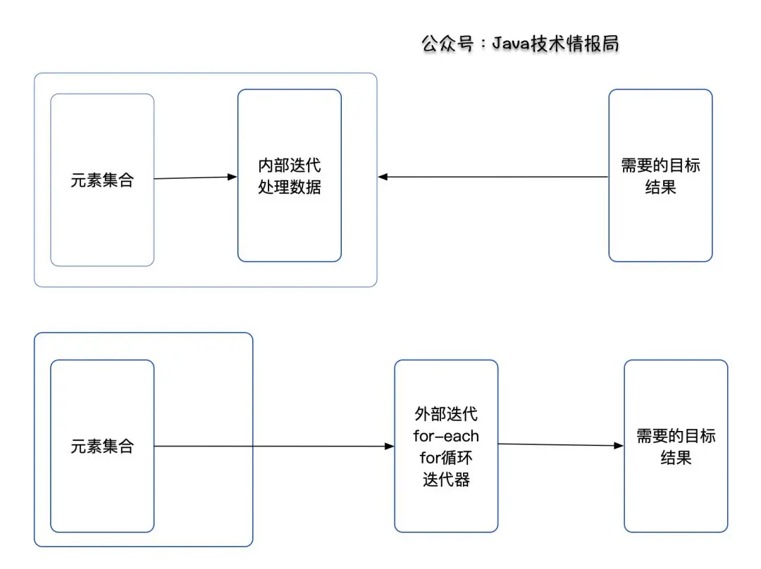 另一个关键的区别就是两者的遍历数据的方式。 Collection接口需要用户去做迭代,for-each,就是外部迭代,去显式的取出每个元素,去处理。而Stream使用的是内部迭代它把迭代已经做了,还把得到的流存储起来。内部迭代的时候,项目可以透明的并行处理,或者是用更好的顺序去处理,Stream库的内部迭代可以自己去选择一种适合你硬件的数据表示和并行实现。