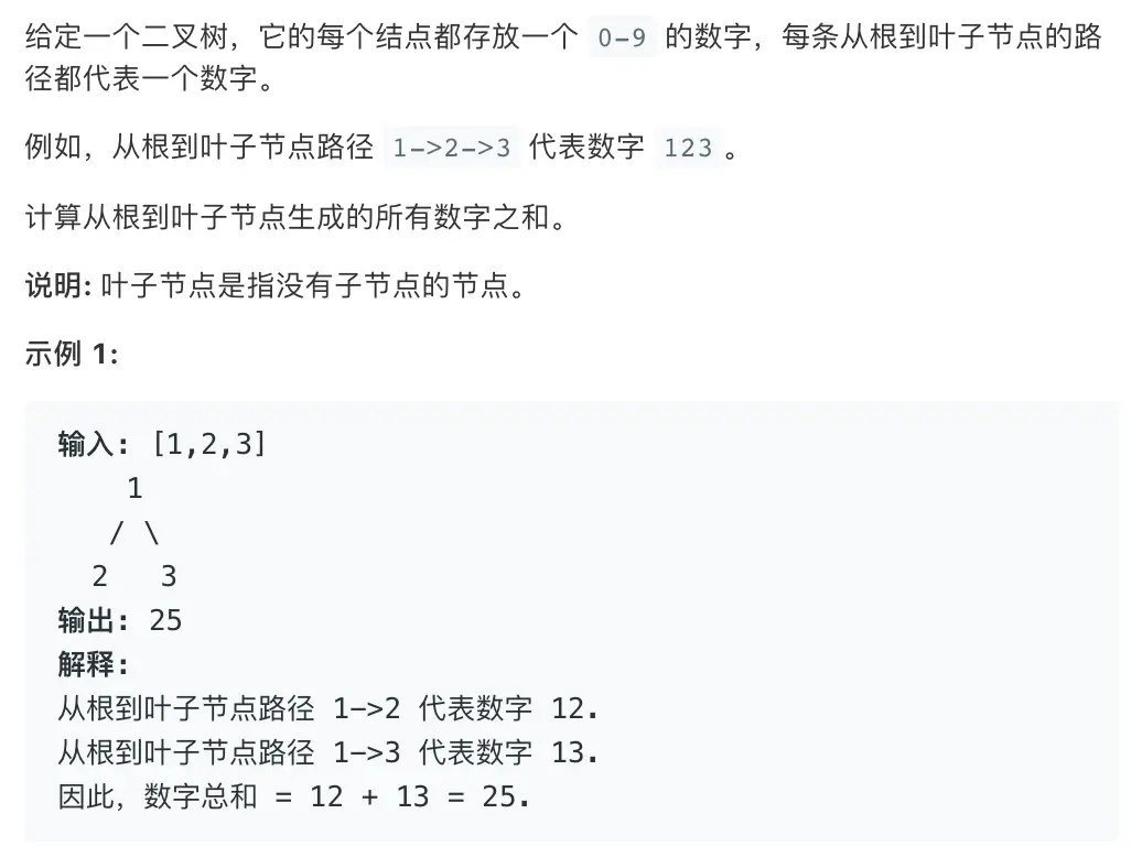 从根结点开始就向下传递的是current_st这个变量,先把每个结点用str+str的方式变成一个str,比如'1','2','3'最终变为'123'。对于左右子树都递归调用深度优先搜索,一旦到了叶结点处,将str转换成int,累加到result中。