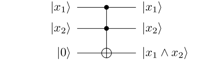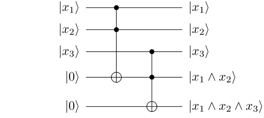 ∣ x 1 , x 2 , x 3 ⟩ ∣ 0 ⟩ → ∣ x 1 , x 2 , x 3 ⟩ ∣ x 1 ∧ x 2 ∧ x 3 ⟩ , |x_1, x_2, x_3\rangle|0\rangle \rightarrow |x_1, x_2, x_3\rangle|x_1 \wedge x_2 \wedge x_3\rangle,∣x1,x2,x3⟩∣0⟩→∣x1,x2,x3⟩∣x1∧x2∧x3⟩,
