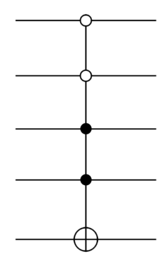 In this notation, an open circle on a control qubit means gates are applied conditional on those control qubits being set to 0 00. In this case, it means the NOT on the target qubit is applied conditional on the first two qubits being set to 0 00 and the third and fourth being set to 1 11. I’ll leave it to you to figure out the details of how to break this down into Toffoli and other standard quantum gates – it’s a good exercise in applying the ideas we’ve been learning.