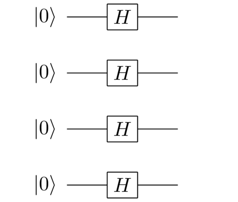 In our circuit model, one of the gates that produces non-classical states is the Hadamard gate. Remember that the Hadamard gate takes the state ∣ 0 ⟩ |0\rangle∣0⟩ to ∣ 0 ⟩ + ∣ 1 ⟩ 2 \frac{|0\rangle+|1\rangle}{\sqrt 2}2∣0⟩+∣1⟩ and ∣ 1 ⟩ |1\rangle∣1⟩ to ∣ 0 ⟩ − ∣ 1 ⟩ 2 \frac{|0\rangle-|1\rangle}{\sqrt 2}2∣0⟩−∣1⟩. A nice thing about the state ∣ 0 ⟩ + ∣ 1 ⟩ 2 \frac{|0\rangle+|1\rangle}{\sqrt 2}2∣0⟩+∣1⟩ is that it’s a truly quantum state which is as agnostic as it’s possible to be about the value of the bit. Suppose we applied a Hadamard gate to all the ∣ 0 ⟩ |0\rangle∣0⟩’s at the start: