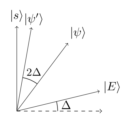 As we saw earlier, the quantum search algorithm doesn’t produce the state ∣ s ⟩ |s\rangle∣s⟩ exactly as output. Instead it produces a quantum state ∣ ψ ⟩ |\psi\rangle∣ψ⟩ which is within an angle Δ \DeltaΔ of ∣ s ⟩ |s\rangle∣s⟩, as shown below (in this example ∣ ψ ⟩ |\psi\rangle∣ψ⟩ has slightly over-rotated past ∣ s ⟩ |s\rangle∣s⟩):