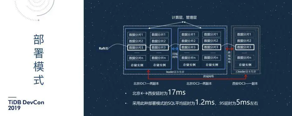 跨城长距离的分布式数据库建设具有很大的挑战。比如北京和西安大概一千多公里,两地距离比较远,延时比较高,我们实测的延时大概是十七毫秒左右。这十七毫秒,如果放在一条 SQL 来讲,一来一回三十几毫秒,这样的延时我们肯定是接受不了。所以在这种情况下,我们用了一个五副本的模式:北京两个 IDC,各放置两副本,西安一个 IDC 放置一个副本,采用 2:2:1 的模式。这样做的好处就是当前端应用请求过来之后,不需要用到北京到西安的这个网络,北京的四个副本中成功三个,就可以给前端实时返回,而且北京的部分实例允许失效。这样做 SQL 平均延时,大概在 1.2 毫秒左右,.95 延时大概 5 毫秒左右,这是比较不错的一个成绩(网联、银联的业务其实要比互联网业务复杂很多)。