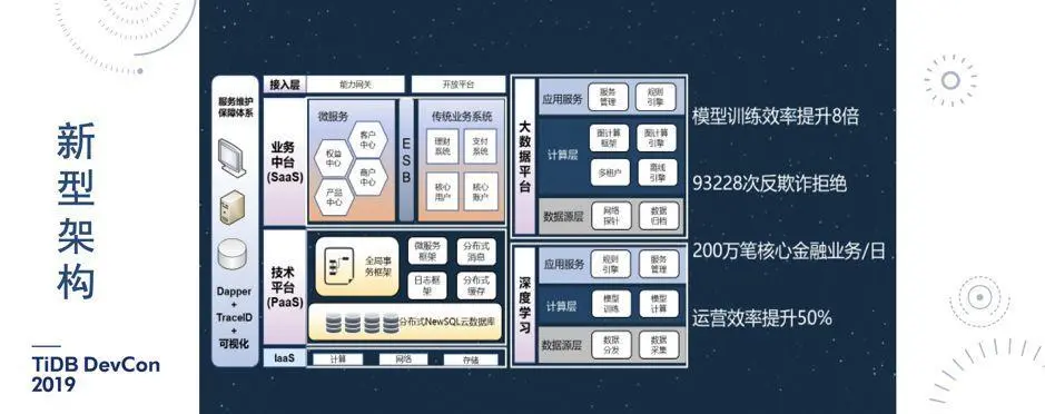 图 9 是我们系统建设架构图的一部分,最底下是分布式 NewSQL 数据库的基础平台,上边是应用系统,目前是传统架构和新型微服务架构并存。