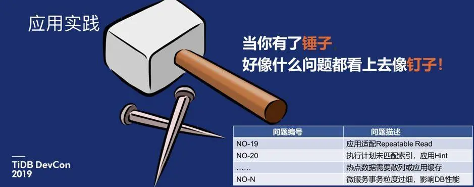 有人说“当你有了锤子,好像什么问题都看上去像钉子”。我们期待从传统数据库过渡到分布式数据库,什么问题都可以解决。但事实上,肯定是没有一个万能的技术方案。图 7 右下角,我列了一些从我们项目开展之初到现在,产生一些问题或者说一些小插曲。