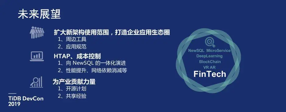 第二,我们要建立一套应用规范,或者说面向 TiDB 的金融级开发的规范指引。目前我们正在做这个事儿,包括最佳研发应用实践以及新老架构并行方案。建设传统数据库和 TiDB 之间的异构数据库传输的中间件是我们目前很重要的一项工作,这部分做完之后,相信对我们扩大应用会比较有好处。