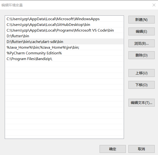 在官方的配置方法中,提到我们在配置完JDK和Android Studio或VS Code环境后,只需要将flutter下面的\flutter\bin以及\flutter\bin\cache\dart-sdk\bin配置到path环境变量中,以在任何目录下使用cmd或者Power Shell使用flutter命令,如下图