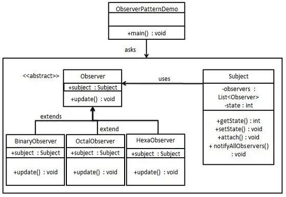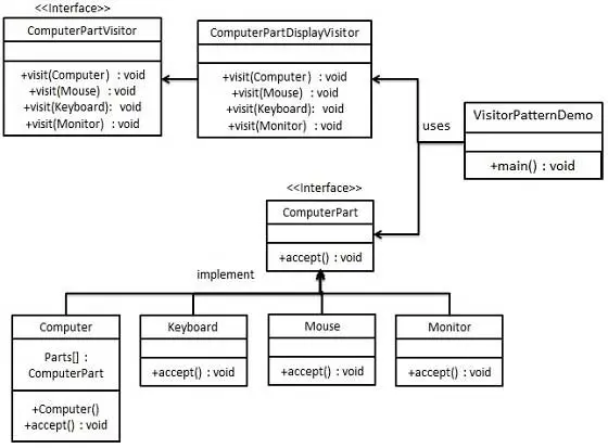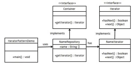 我们将创建一个叙述导航方法的 Iterator 接口和一个返回迭代器的 Container 接口。实现了 Container 接口的实体类将负责实现 Iterator 接口。
