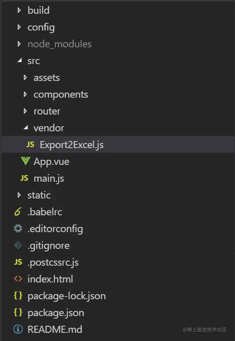 使用脚手架搭建出基本项目雏形,这时候在src目录下新建一个vendor(文件名自己定义)文件夹,新建一个Export2Excel.js文件,这个文件里面在js-xlsx的基础上又封装了Export2Excel.js来方便导出数据。