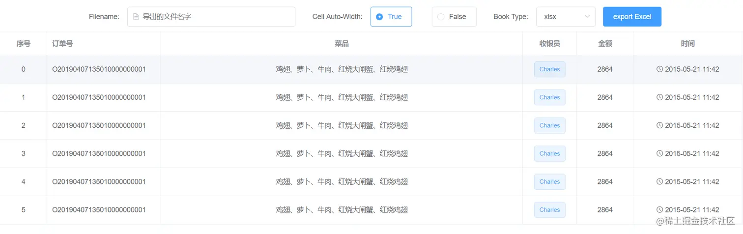 const tHeader = ["序号", "订单号", "菜品", "收银员", "金额", "时间"];