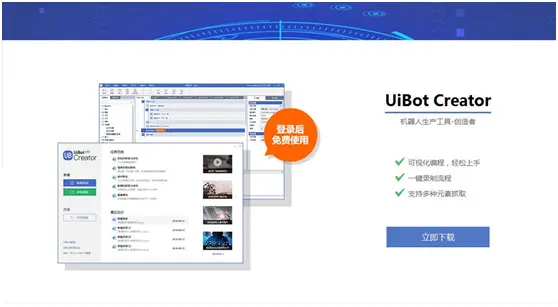 ●其次,纸上谈兵终觉浅,看了再多的文献,也不如亲自动手去体验下到底什么是RPA。UiBot就为您提供了这个机会。在UiBot官网上,即可下载到最新版本的免费学习软件,正所谓工欲善其事必先利其器,相信有了UiBot这样的RPA利器,对您了解和学习如何使用RPA会有极大地帮助。