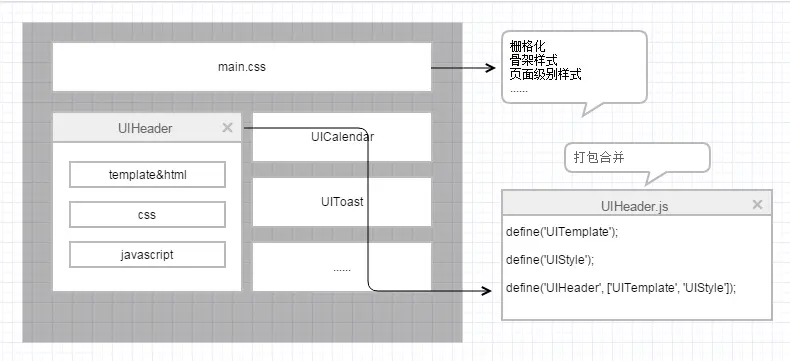 业务组件一般重用性较低,会产生模块间的业务耦合,还会对业务数据产生依赖,但是主体仍然是HTML&CSS&Javascript,这部分代码也是经常导致冗余的,如果能按模块拆分,可以很好的控制这一问题发生: