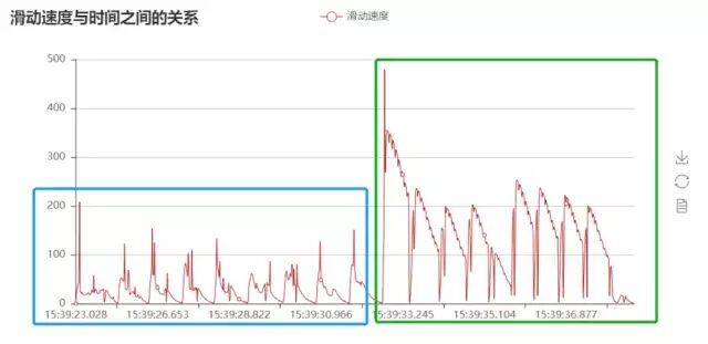 我叫我同学试了试,我把滑动速度的日志打印下来作了这个图。蓝色部分是他缓慢滑动的速度,绿色部分是他快速滑动的速度图像。缓慢滑动速度基本在在100一下,我试了一下也差不多是这个曲线,那么就愉快的使用这个阈值吧。专门去学了一下python可视化内容(哇!Python画图确实方便)。