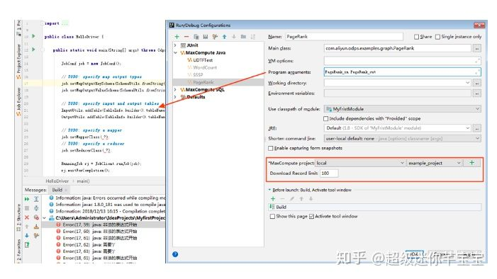 - 运行Graph: 在驱动类(有main函数且调用GraphJob.run方法)上右键,点击运行run configuration**对话框,配置Graph需要在哪个MaxCompute Project上运行即可。