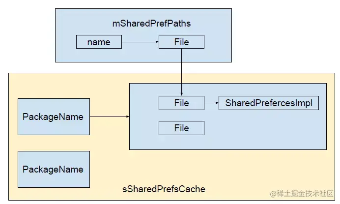 ( ArrayMap<String, ArrayMap<File, SharedPreferencesImpl>> ) sSharedPrefsCache 存放包名与ArrayMap键值对 初始化时会默认以包名作为键值对中的Key,注意这是个static变量;