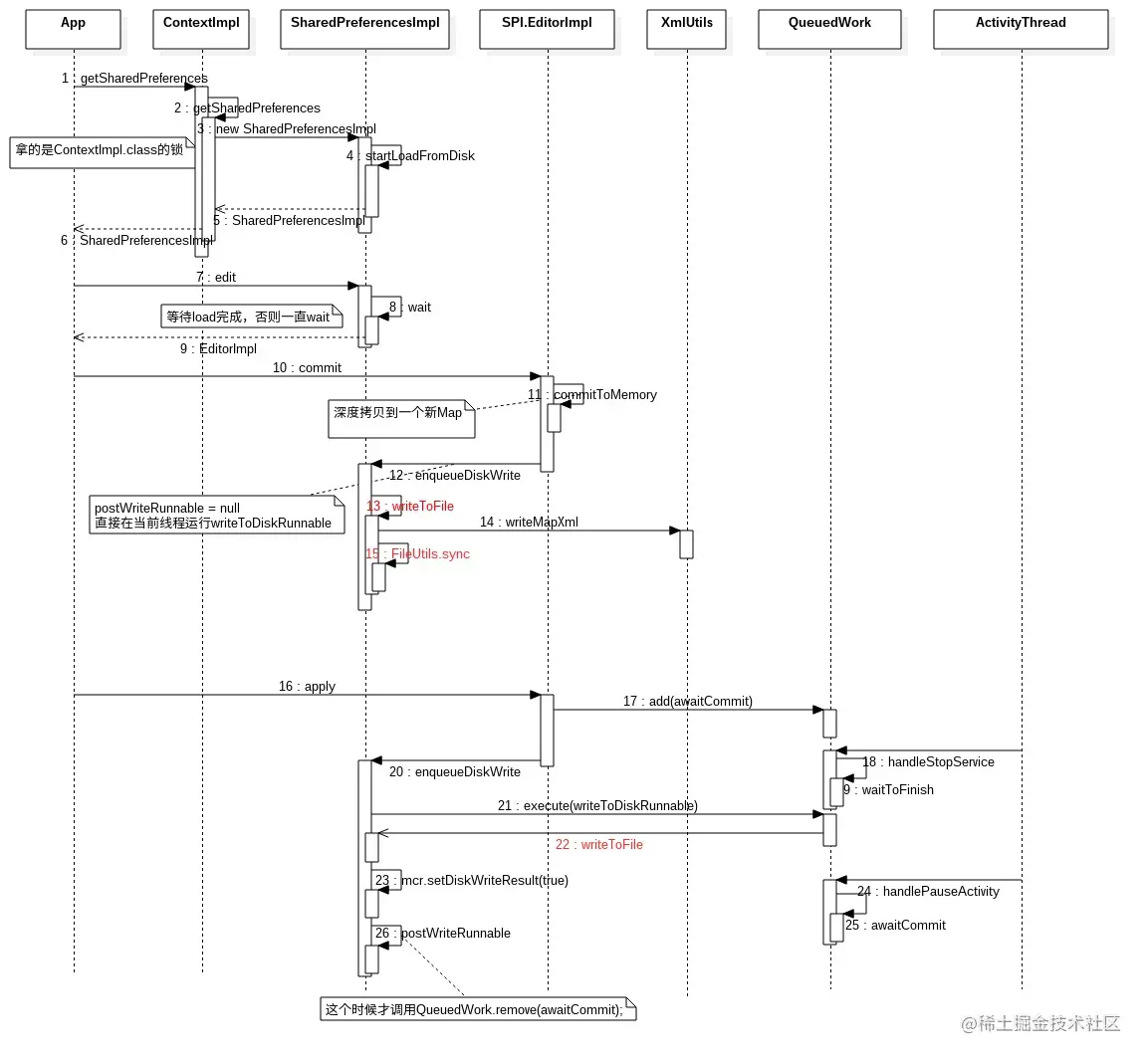 - commit是把内容同步提交到硬盘的,而apply先立即把修改提交到内存,然后开启一个异步的线程提交到硬盘,并且如果提交失败,你不会收到任何通知。
