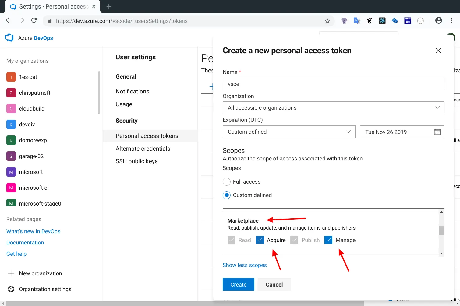 点击 Create ,复制生成的 token,之后就要用到我们刚才安装的 vsce 来创建新的发布者(publisher)