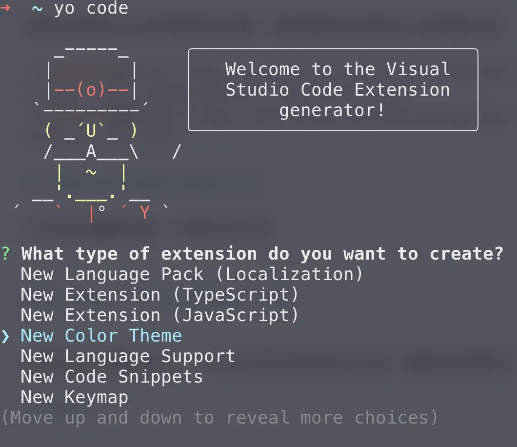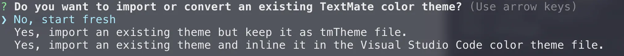 我们要开发一个主题,所以选中 New Color Theme,之后会继续询问你是否新建主题还是从现有主题导入,我们这里选创建一个全新的。