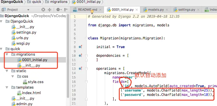 我们增加了两个字段username和password,Django默认支持orm。