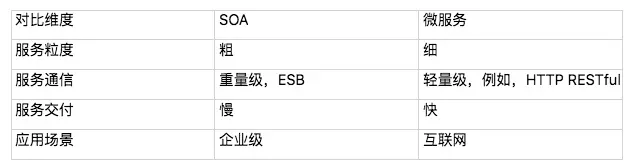 - SOA采用了ESB作为服务间通信的关键组件,负责服务定义、服务路由、消息转换、消息传递,总体上是重量级的实现;微服务推荐使用统一的协议和格式,例如,RESTful协议、RPC协议,无须ESB这样的重量级实现