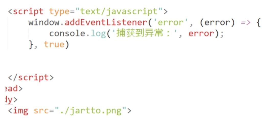 由于网络请求异常不会事件冒泡,因此必须在捕获阶段将其捕捉到才行,但是这种方式虽然可以捕捉到网络请求的异常,但是无法判断 HTTP 的状态是 404 还是其他比如 500 等等,所以还需要配合服务端日志才进行排查分析才可以。