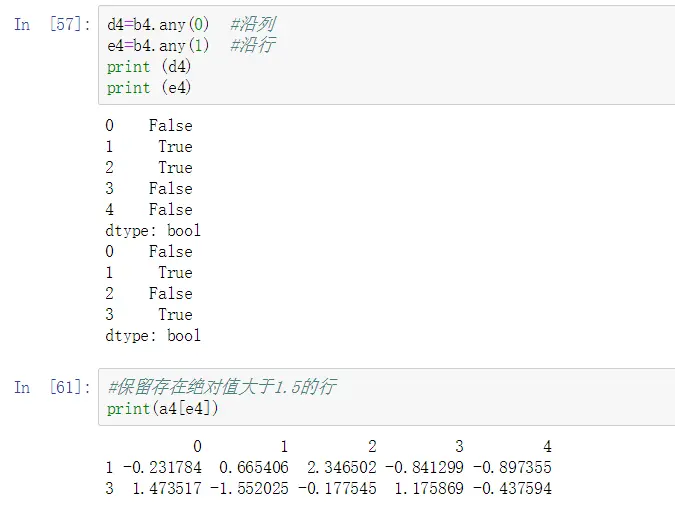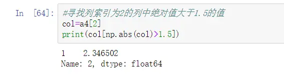 此时,若想要在特定的某一列中寻找特定的值: 若想要选取存在绝对值大于1.5的数据的行,通过布尔数组配合any()实现: