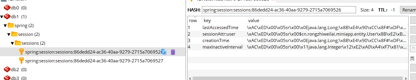 但是这样就没有token什么事了,并没有是使用token来做验证。如果要想使用token(sessionId)获取到user,第一个想法就是直接从使用redisTemplate的hash操作,根据key获取到里面的内容,查看一下redis存储session的key,如图: