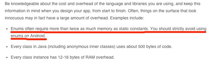 枚举占用的空间通常是静态常量的两倍。你应该严格避免在 Android 中使用枚举。