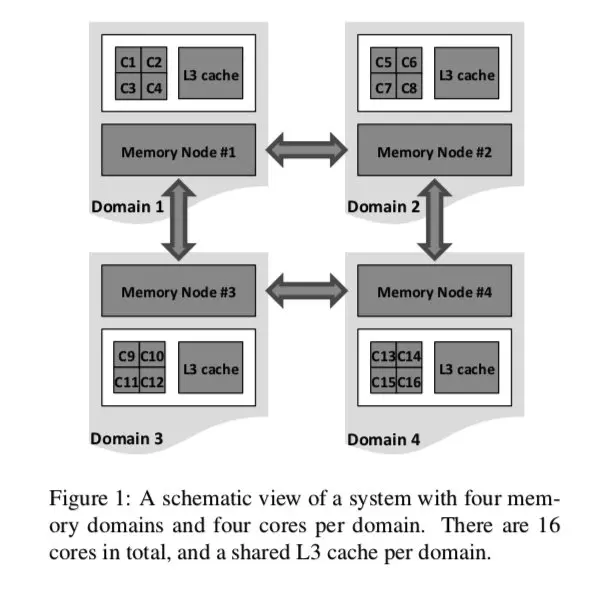 这种算法在 UMA 中是有效的。但是需要考虑到的是, NUMA 相比 UMA 有一点很大的不同,那就是 UMA 只有一个 memory node,配备一个 memory controller;而 NUMA中 每个 node 里面都有一个 memory node,各自配备了一个 memory controller,如下图所示:16个核被分为了4个 node,每个 node 有一个独立的 memory(当然每个核都可以访问任意位置的内存)。