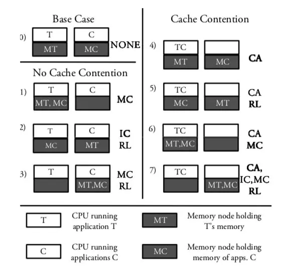 - 图2: 两个程序都需要试用进行CPU 之间的快速通道,产生了interconnect connection(IC)竞争。同时还有访问远程 memory 带来的访问延迟(RL)。