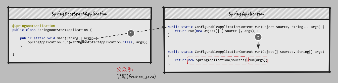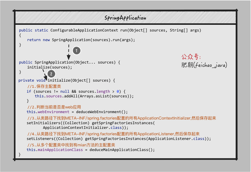 肥朝公众号粉丝: SpringApplication.run一共做了两件事,一件是创建SpringApplication对象,在该对象初始化时,找到配置的事件监听器,并保存起来.第二件事就是运行run方法,此时会将刚才保存的事件监听器根据当前时机触发不同的事件,比如容器初始化,容器创建完成等.同时也会刷新IoC容器,进行组件的扫描、创建、加载等工作.这两件事我都看过源码,我分别给你画个图细致讲一讲.