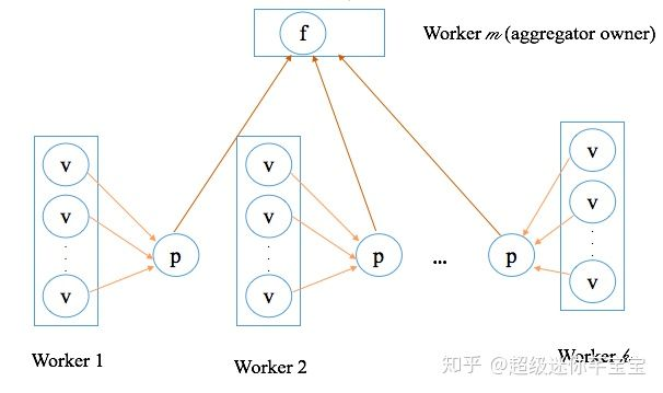 Aggregator的逻辑分两部分,一部分在所有Worker上执行,即分布式执行,另一部分只在AggregatorOwner所在Worker上执行,即单点。其中在所有Worker上执行的操作包括创建初始值及局部聚合,然后将局部聚合结果发送给AggregatorOwner所在Worker上。AggregatorOwner所在Worker上聚合普通Worker发送过来的局部聚合对象,得到全局聚合结果,然后判断迭代是否结束。全局聚合的结果会在下一轮超步分发给所有Worker,供下一轮迭代使用。 如下图所示 :